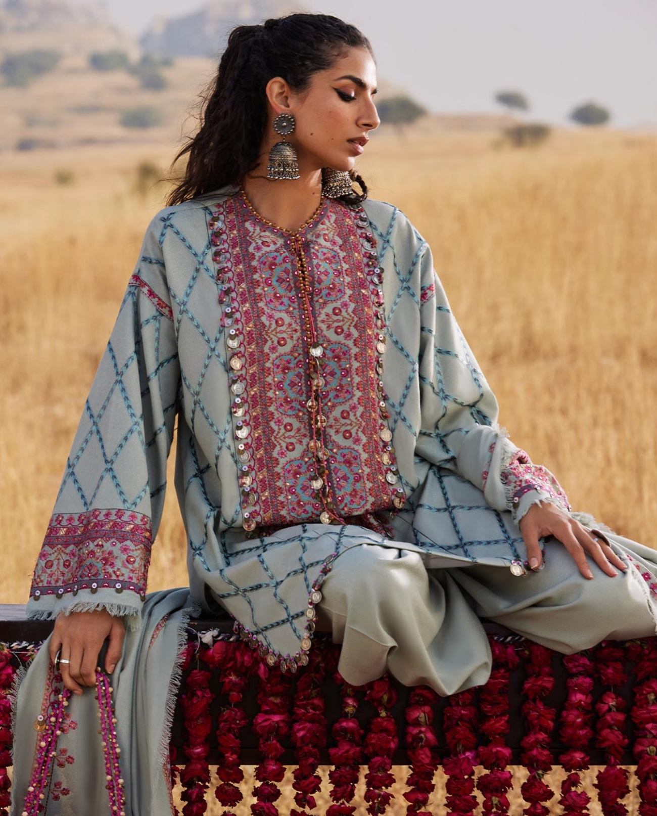 Nayab embodies the wild elegance of winter — a soft karandi shirt that drapes like whispered stories, paired with a flowing dupatta that moves with the rhythm of the wind. Crafted from breathable, premium karandi fabric, the shirt offers a perfect blend of comfort and structured sophistication, while subtle tribal-inspired details add depth and intrigue.