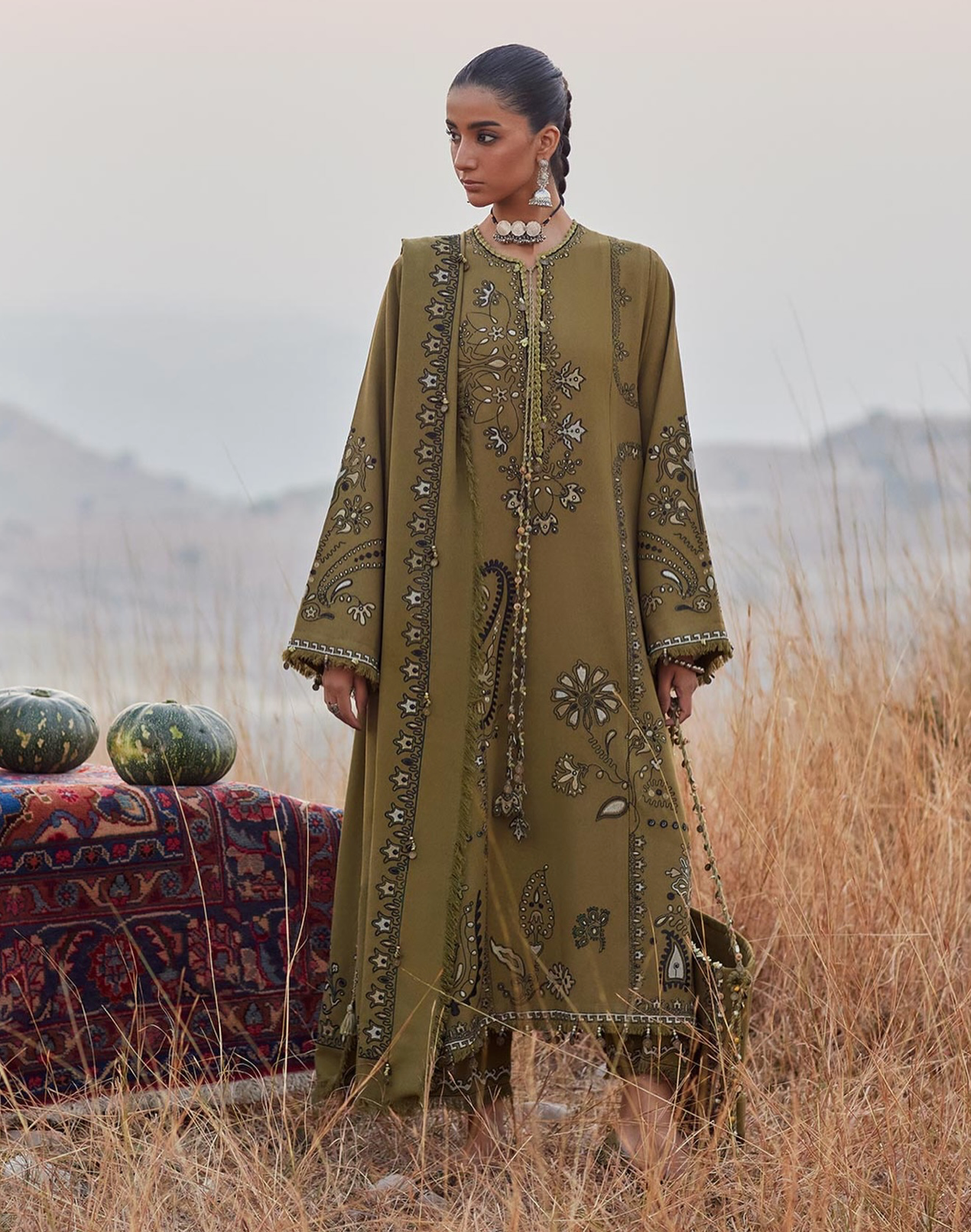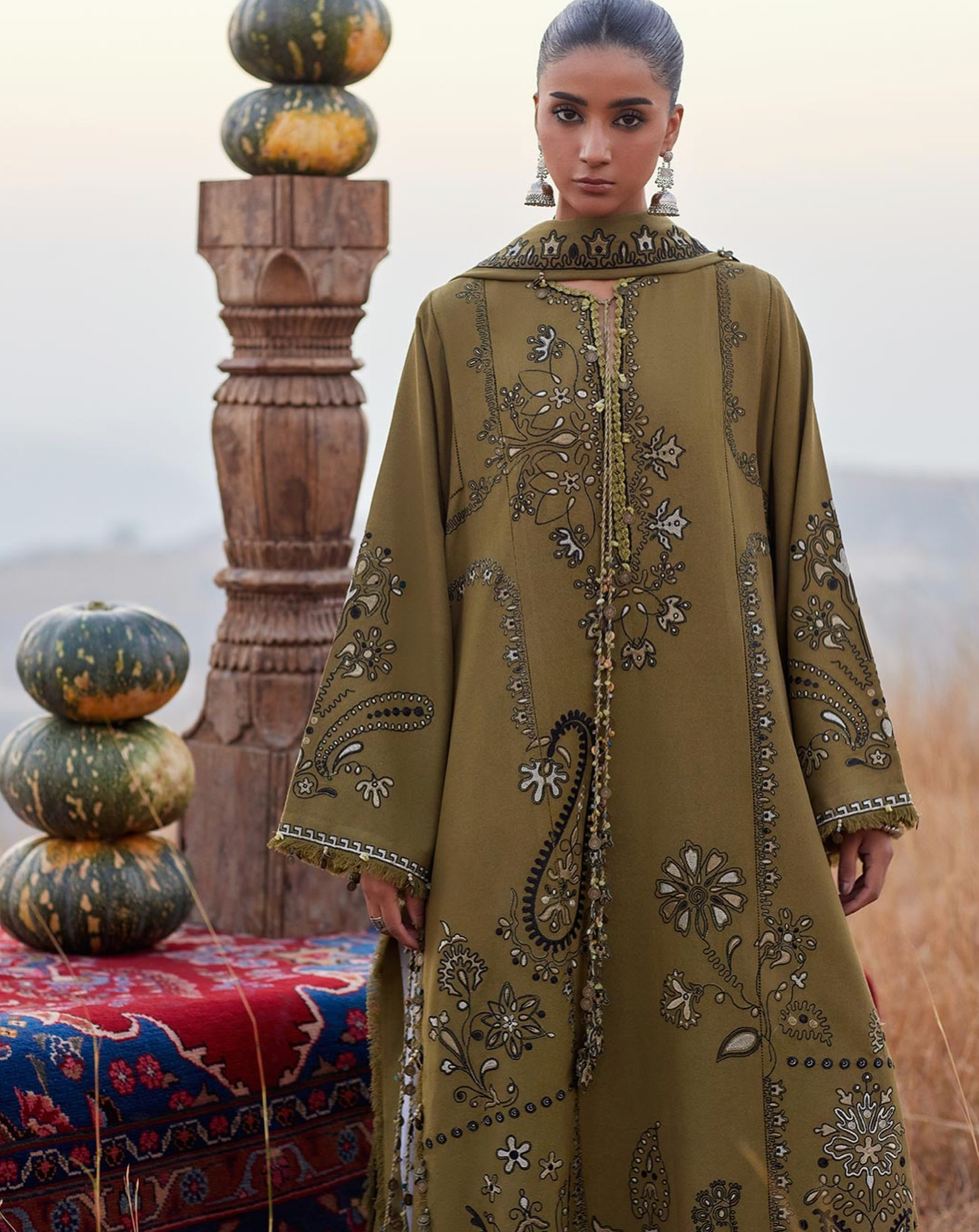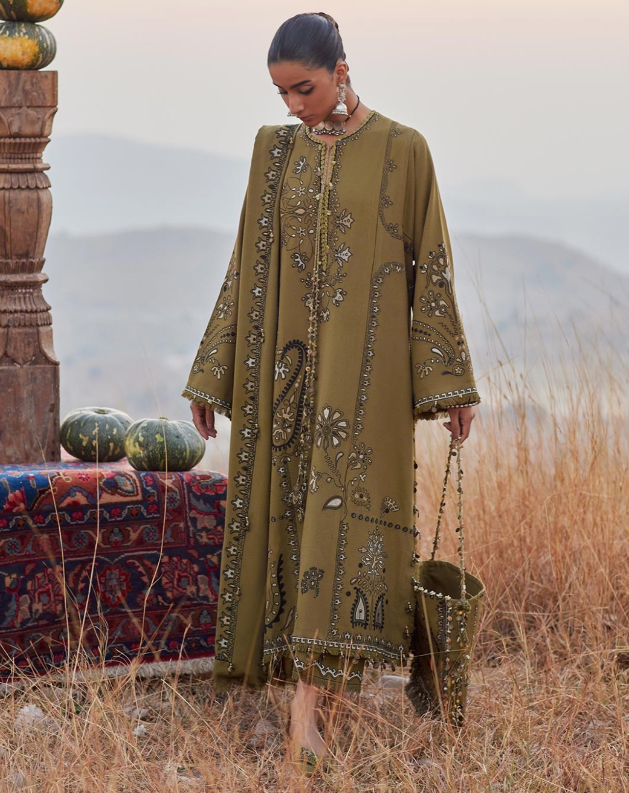 Nayra — Crafted on plush winter karandi, this olive-toned ensemble blooms with bold paisley motifs and free-flowing tribal florals. Raw edges, textured stitches, and earthy embellishments come together to create a look that feels grounded, moody, and beautifully untamed.