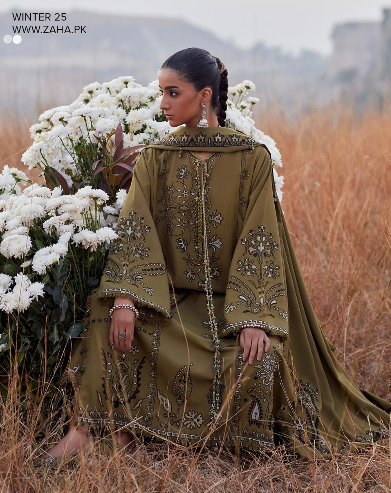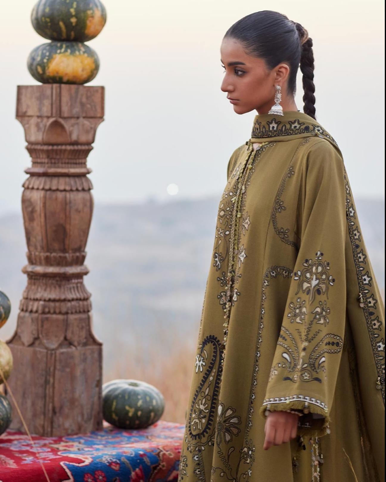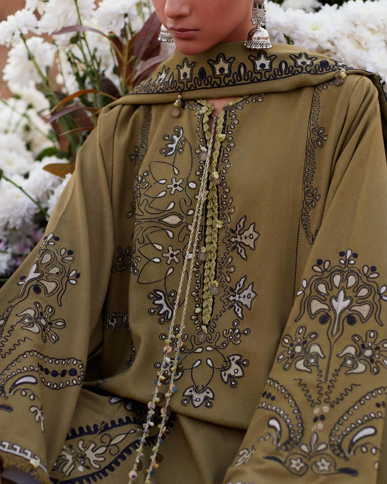 Nayra — Crafted on plush winter karandi, this olive-toned ensemble blooms with bold paisley motifs and free-flowing tribal florals. Raw edges, textured stitches, and earthy embellishments come together to create a look that feels grounded, moody, and beautifully untamed.
