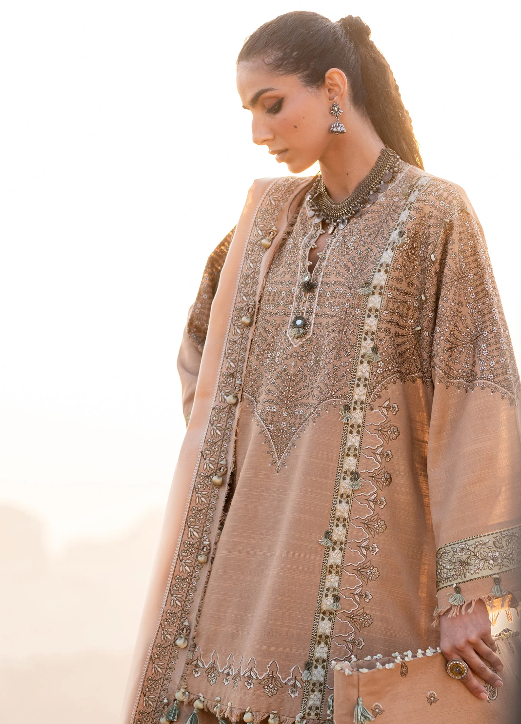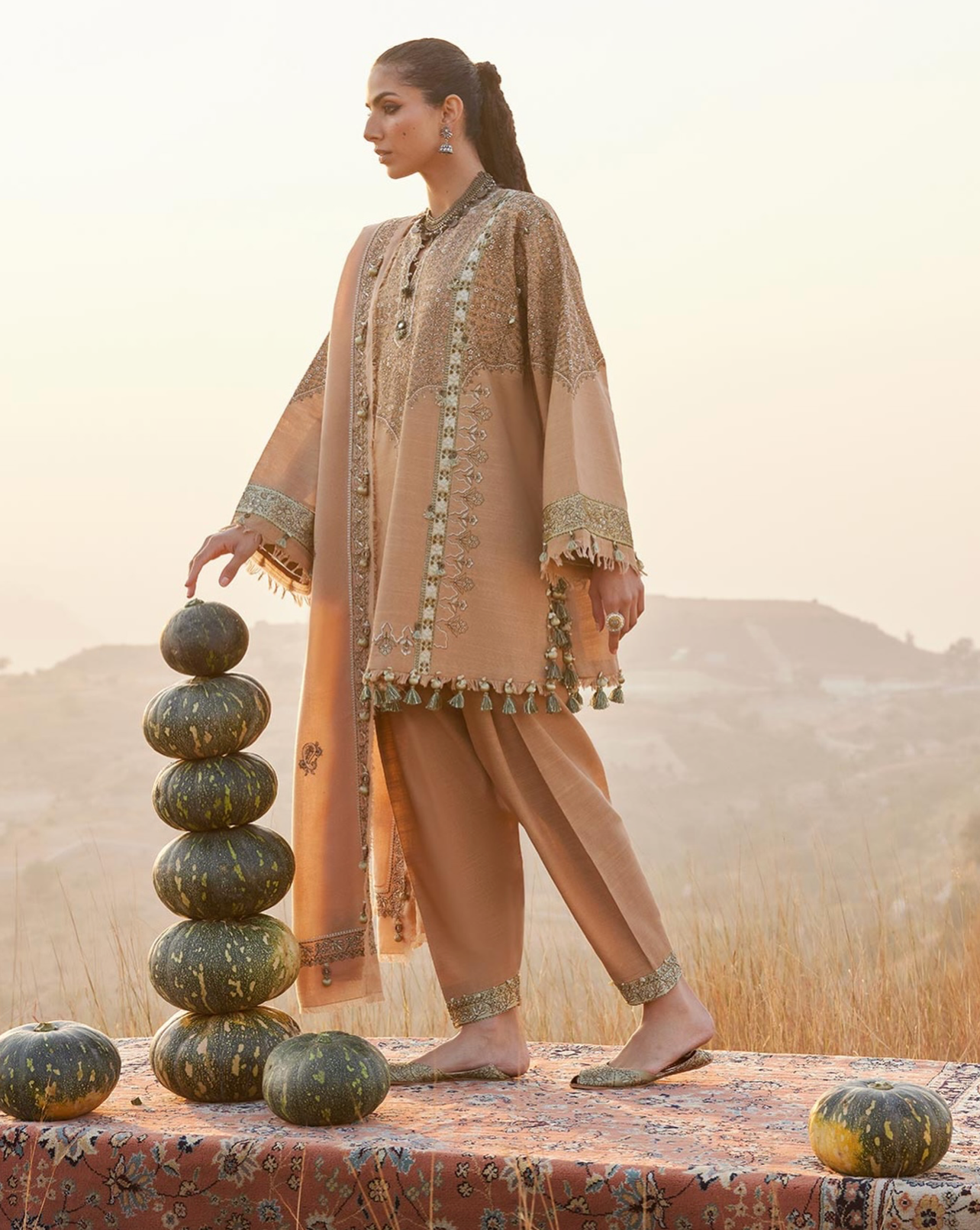 Neelam — a hushed gold khaddar shirt and trouser set, threaded with delicate Kashmiri whispers. Beige, charred grain, and ebony tones collide in a timeless, wintery hush, while a soft woolen shawl drapes like a drifting winter breeze — effortless, bold, and untamed, just like the Zaha woman.