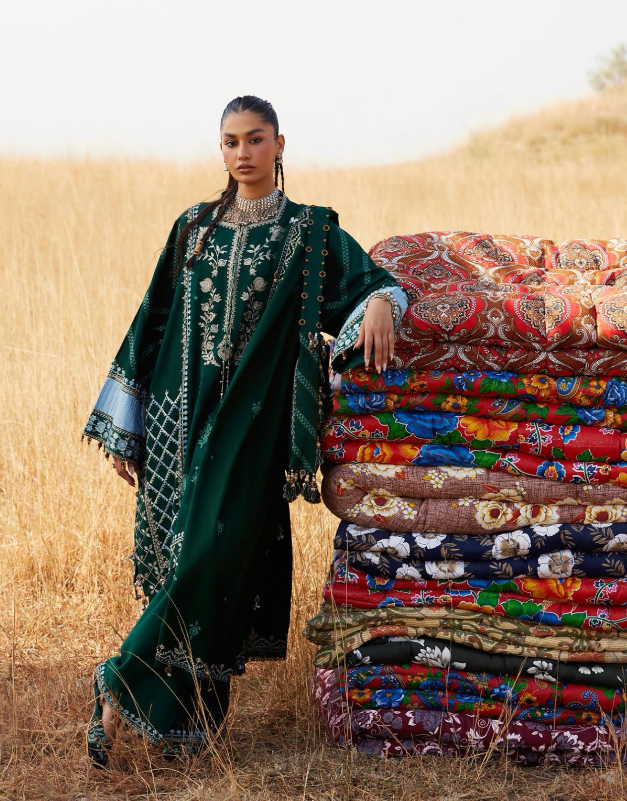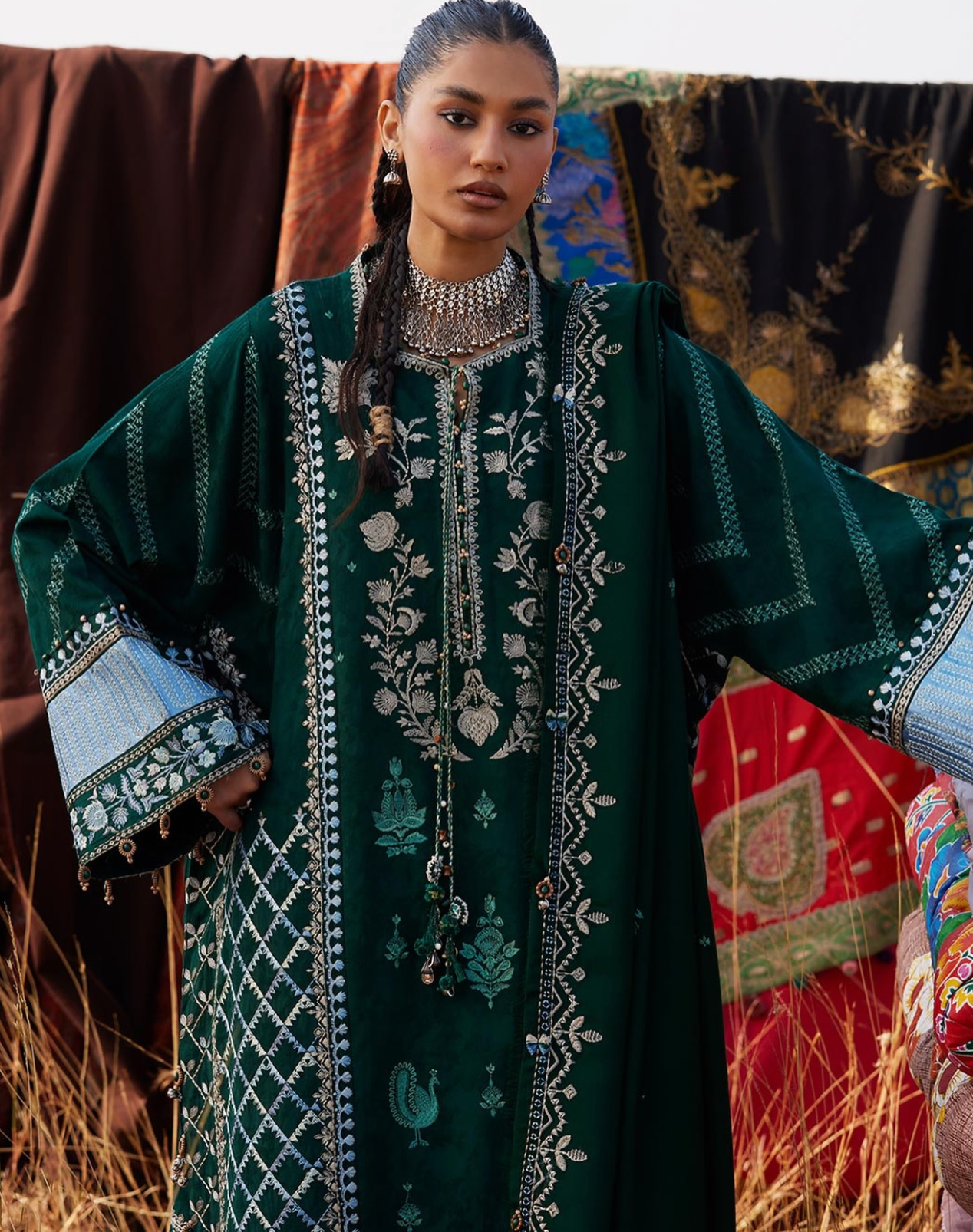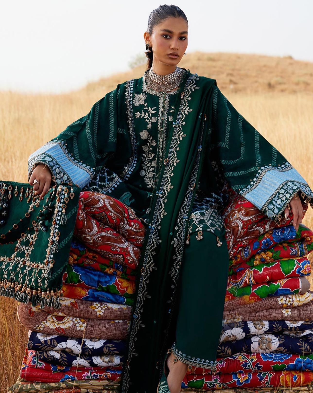 Yasmin — winter green jacquard khaddar shirt and trouser, layered with a soft woolen shawl, infused with steel-blue tribal echoes. Each thread whispers the stories of ancestral motifs, stitched with care, weaving a quiet winter tale that moves with effortless elegance. Moody, grounded, and timeless — Yasmin is winter embodied.