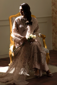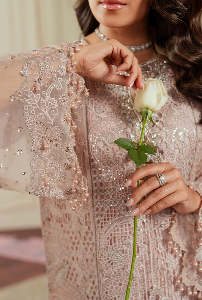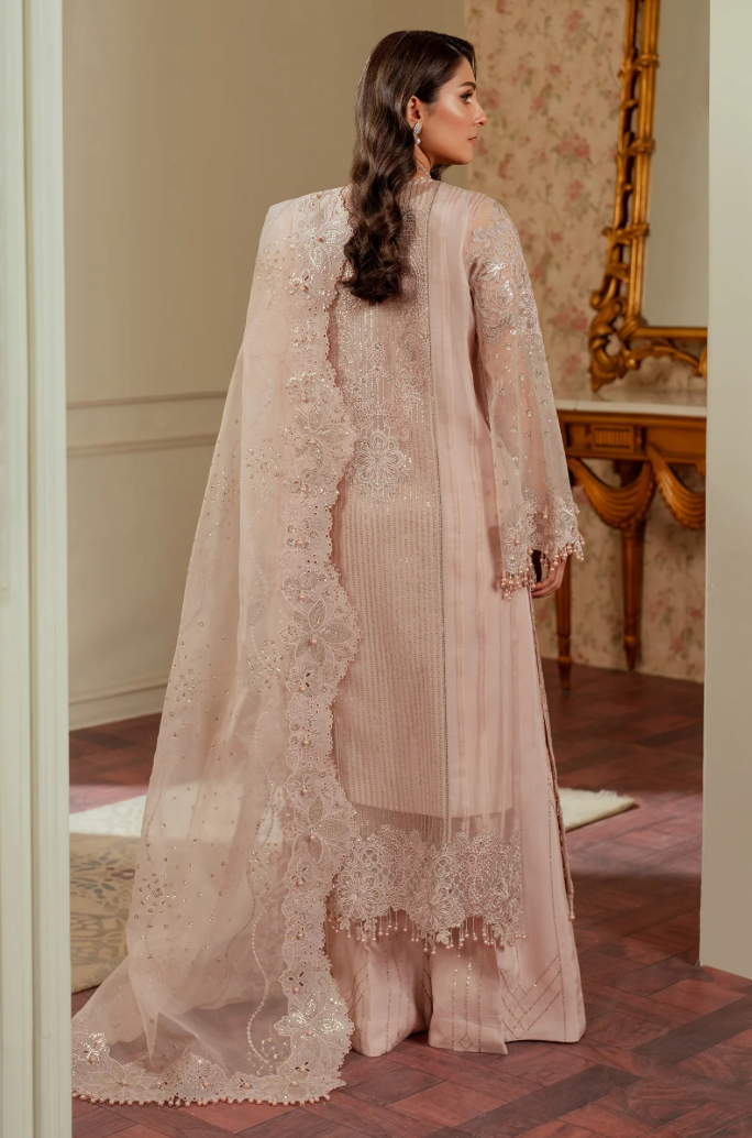 This outfit look is elevated by an organza dupatta, ripe for enhancement with pink-on-pink motifs, silver tilla, and sequins.