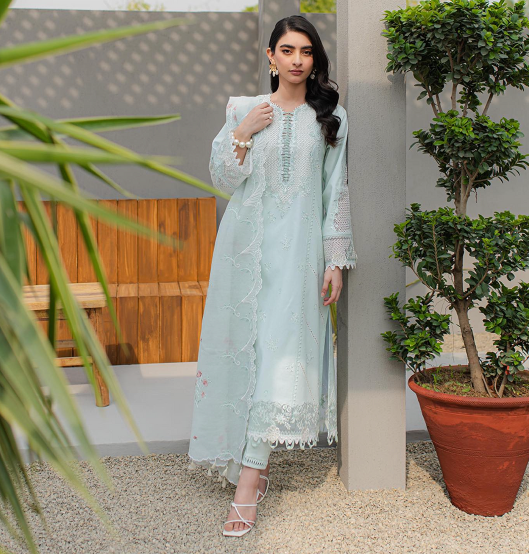 Shirt Chikan kari Embroidered Neckine (Front) Chikan kari Embroidered (Front) Embroidered Border (Front & Back) Chikan kari Embriodered (Back) Embroidered Neckine (Back) Embroidered Patch (Sleeves) Embroidered Motifs (Sleeves) Trouser Plain Trouser Dupatta Embroidered Dupatta Fabric Details Shirt = Lawn Dupatta = Jacquard Weaved Trouser Cotton